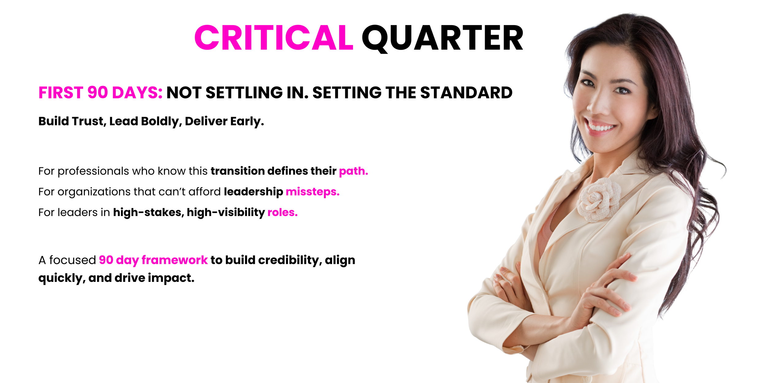 For organizations, Critical Quarter reduces ramp-up time, minimizes early missteps, and accelerates leadership effectiveness when it matters most.
